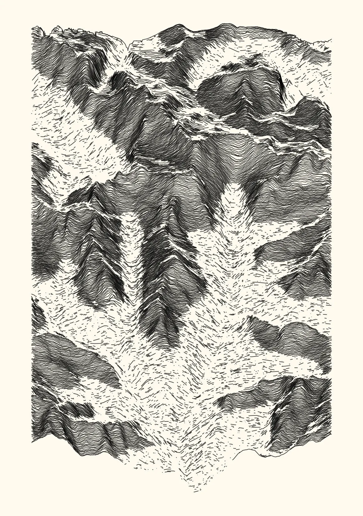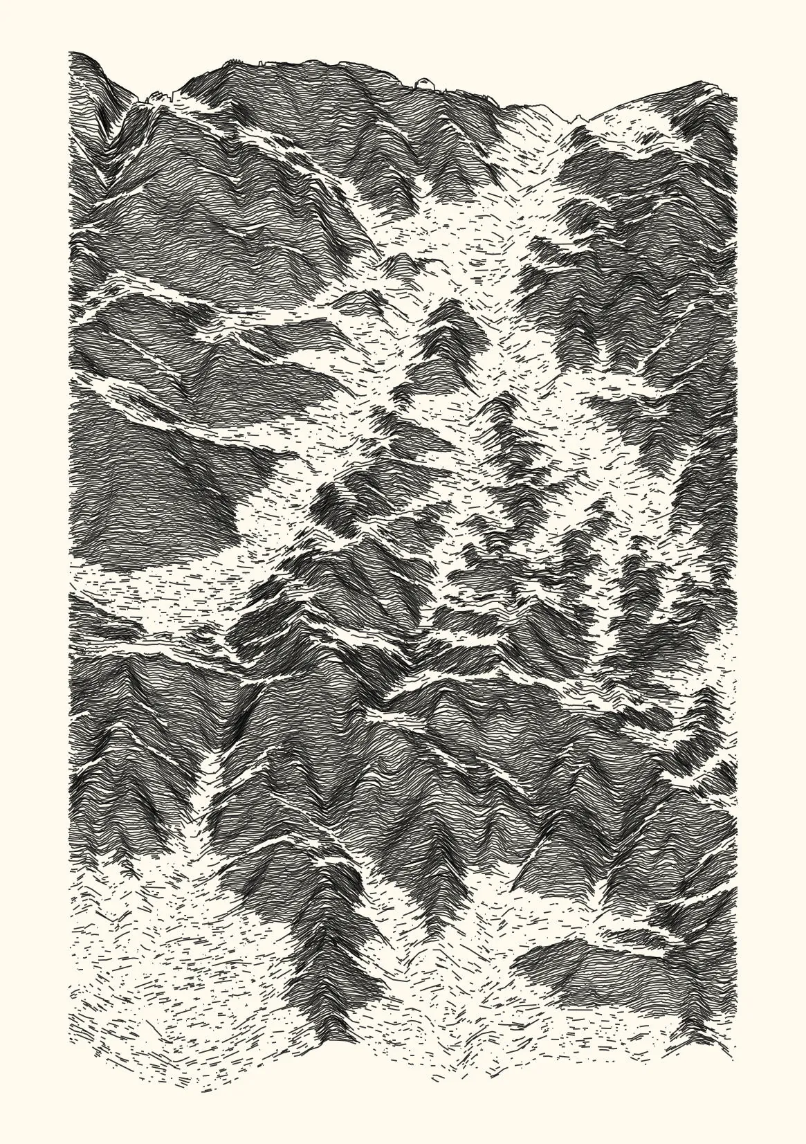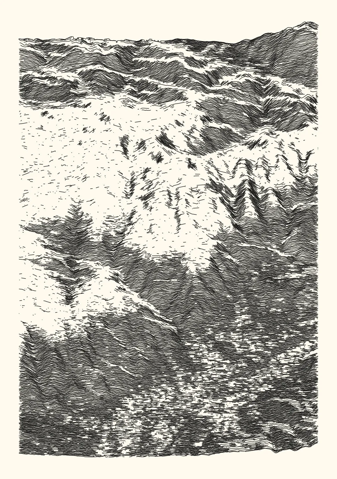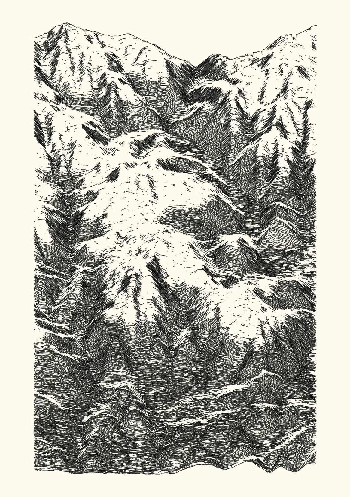 get_features_ridge(seed = 15) |> gen_dispyr(n_ridges = 800) |> plot_ridge()Process topographical data into monochromatic ink sketches.