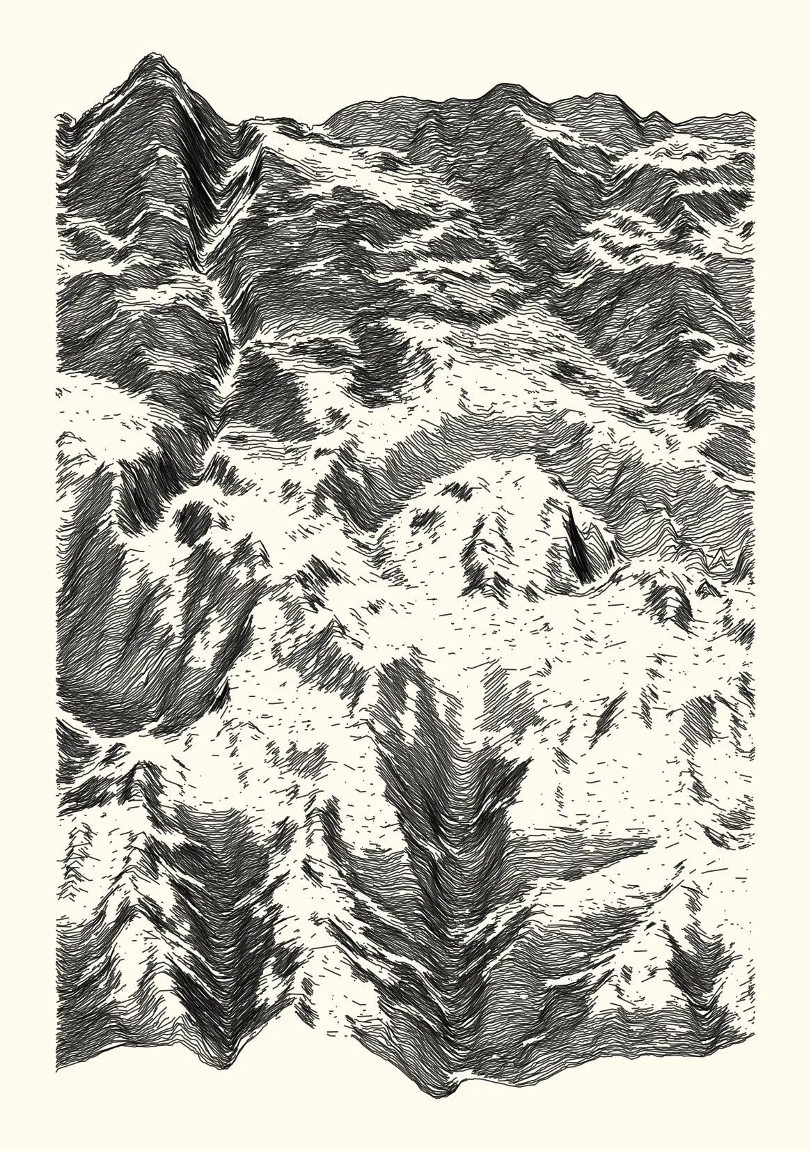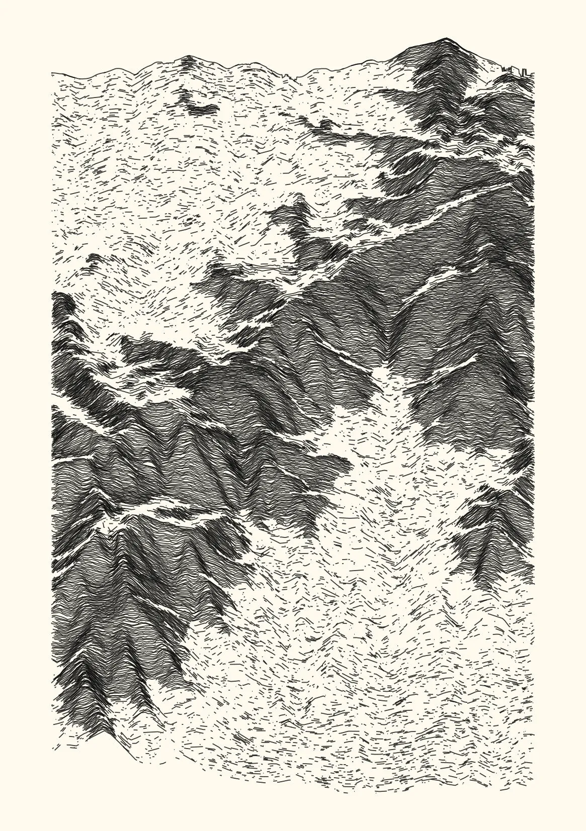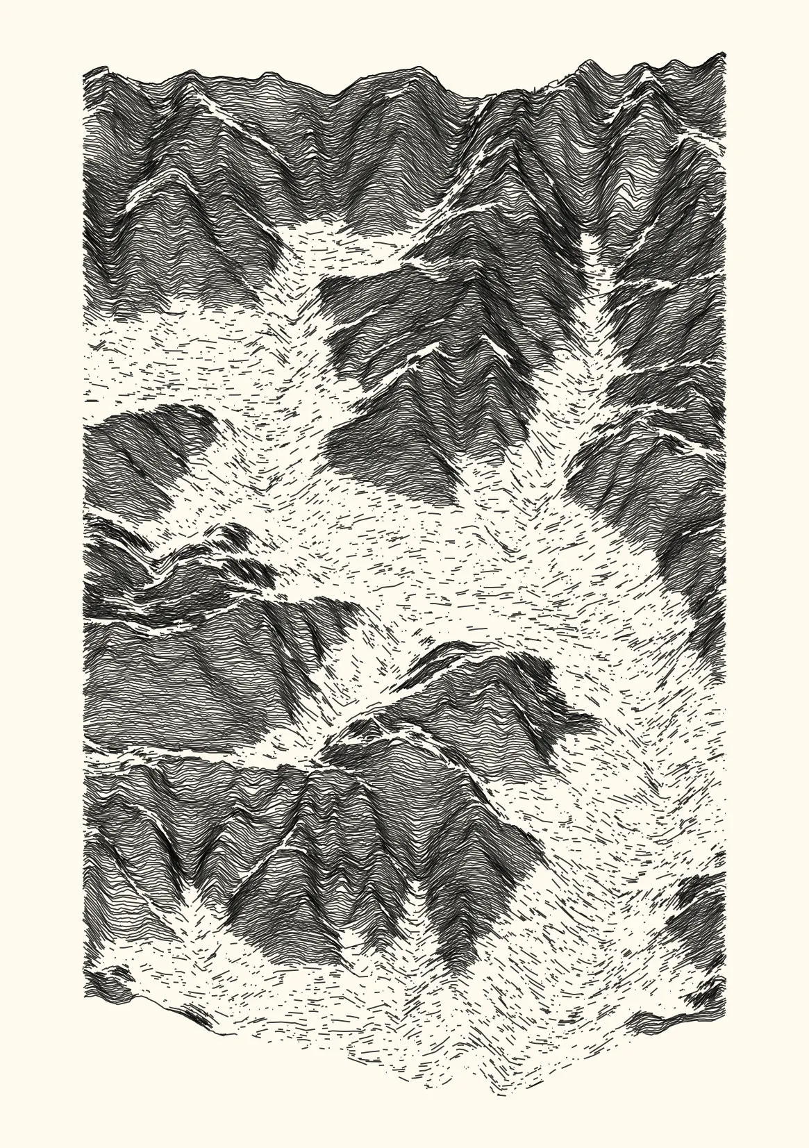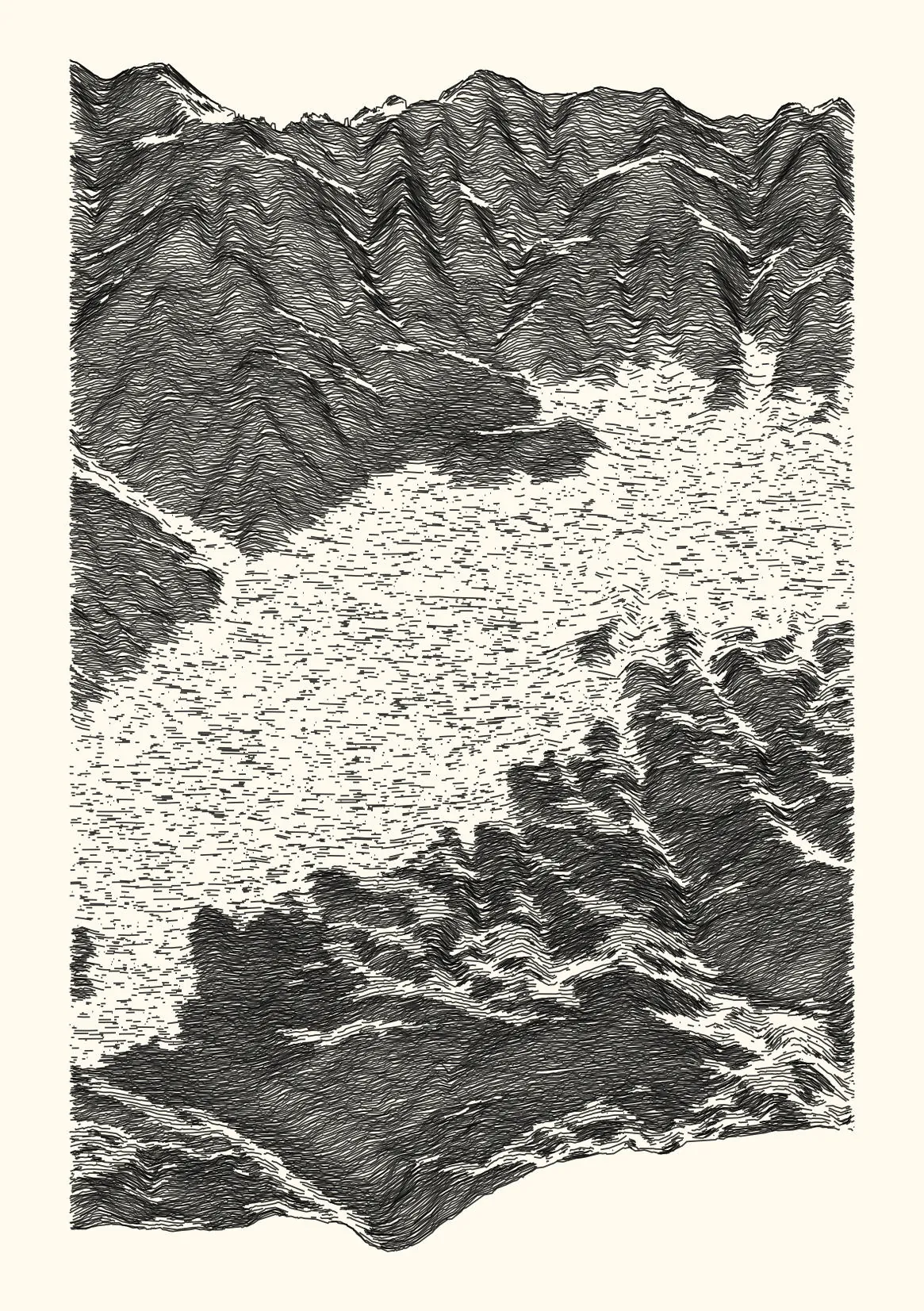 get_features_ridge(seed = 15) |> gen_dispyr(n_ridges = 800) |> plot_ridge()Process topographical data into monochromatic ink sketches.
