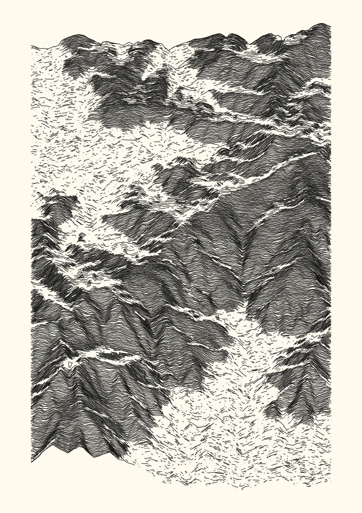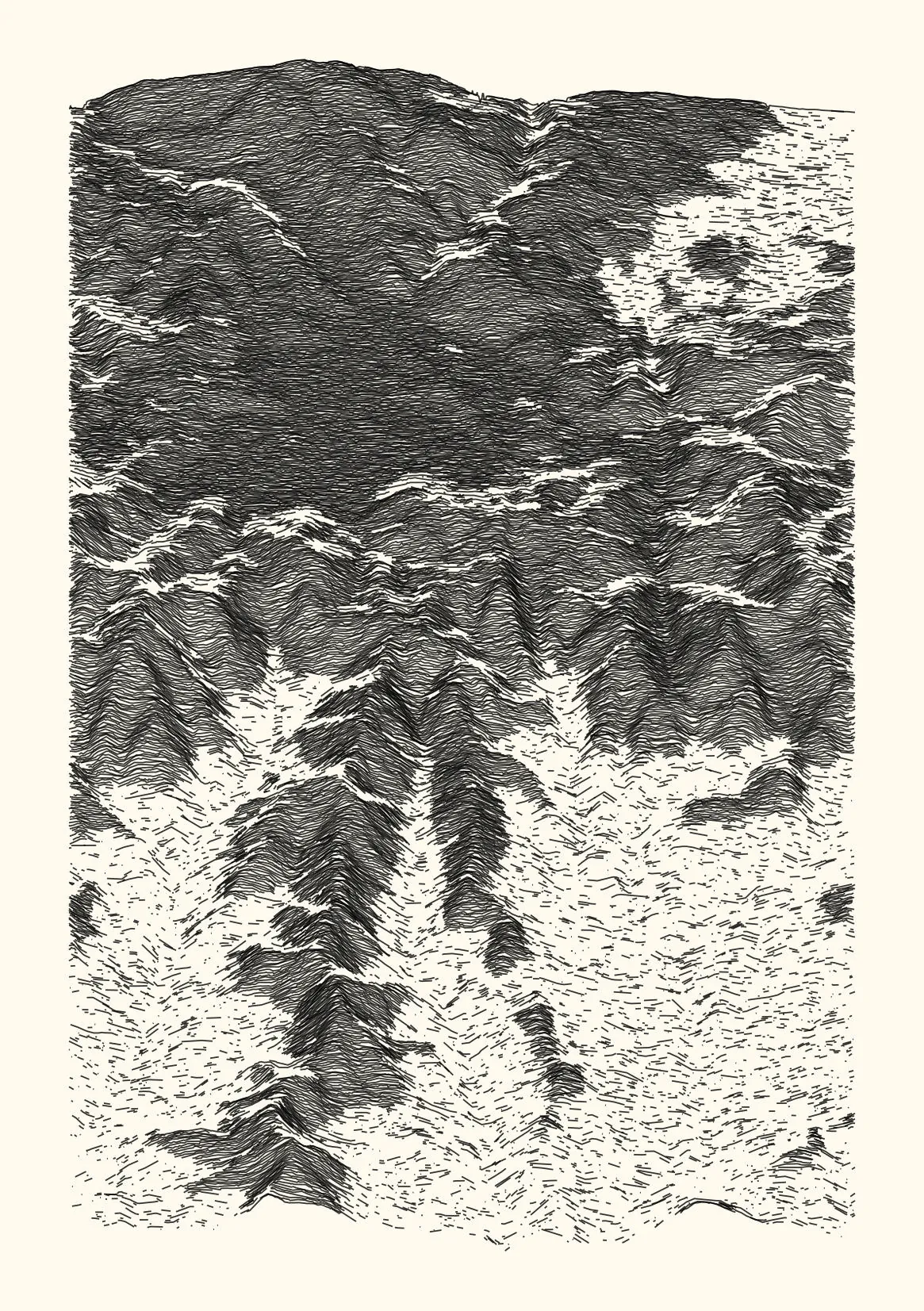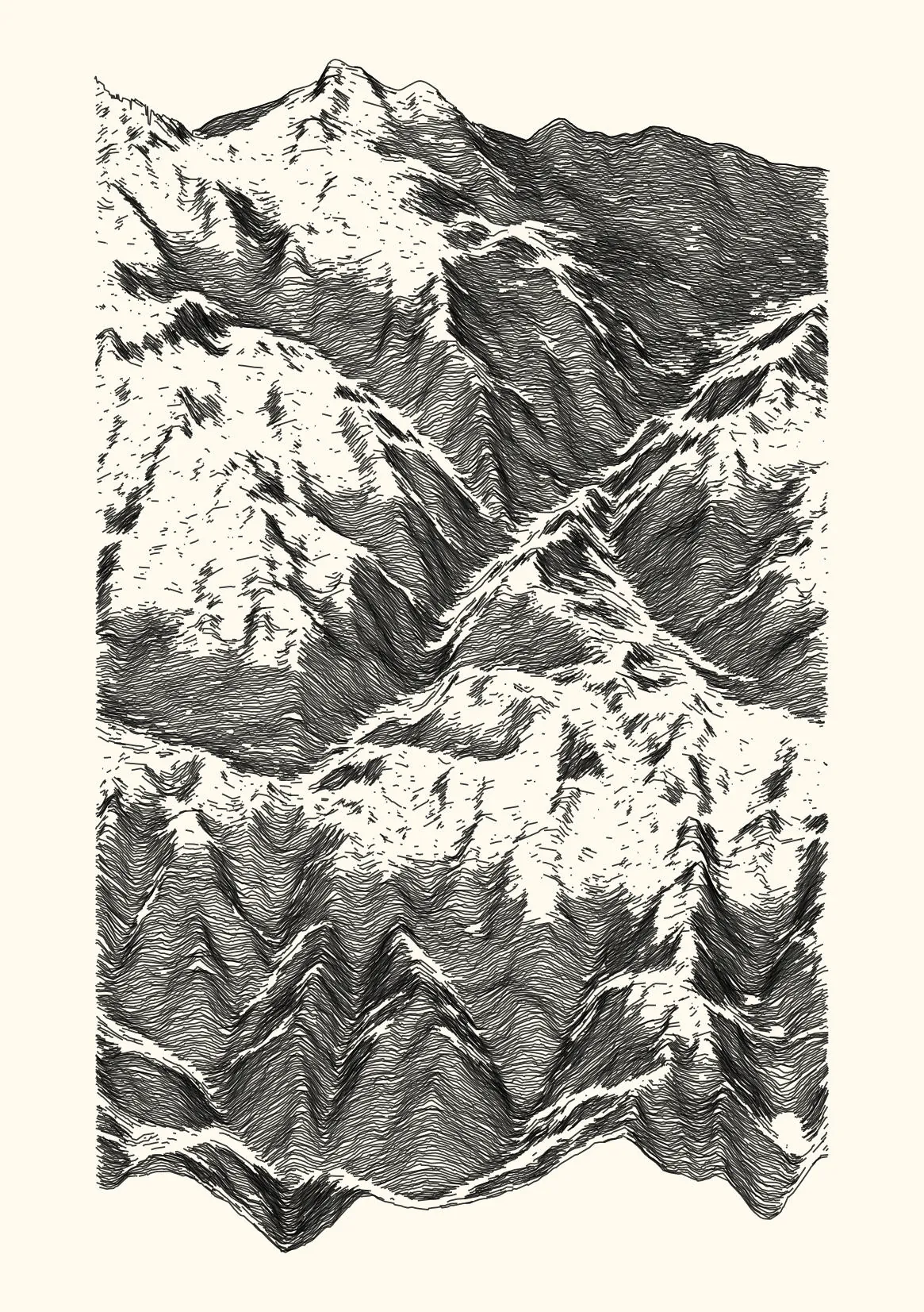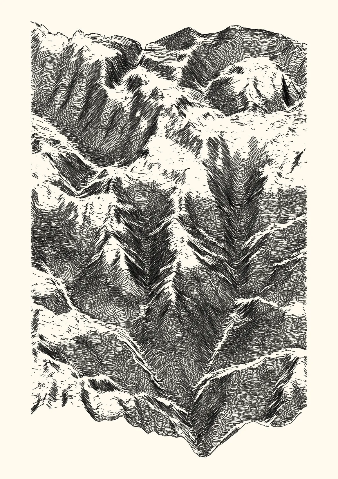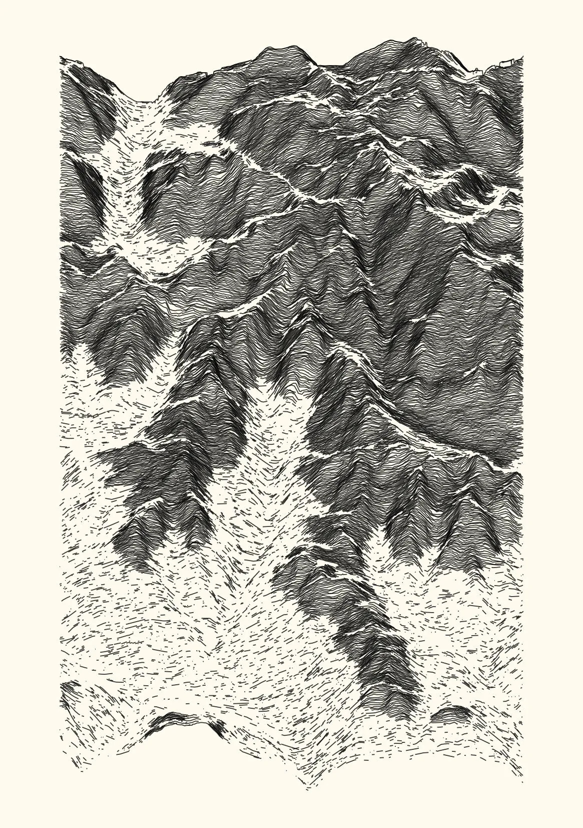 get_features_ridge(seed = 15) |> gen_dispyr(n_ridges = 800) |> plot_ridge()Process topographical data into monochromatic ink sketches.