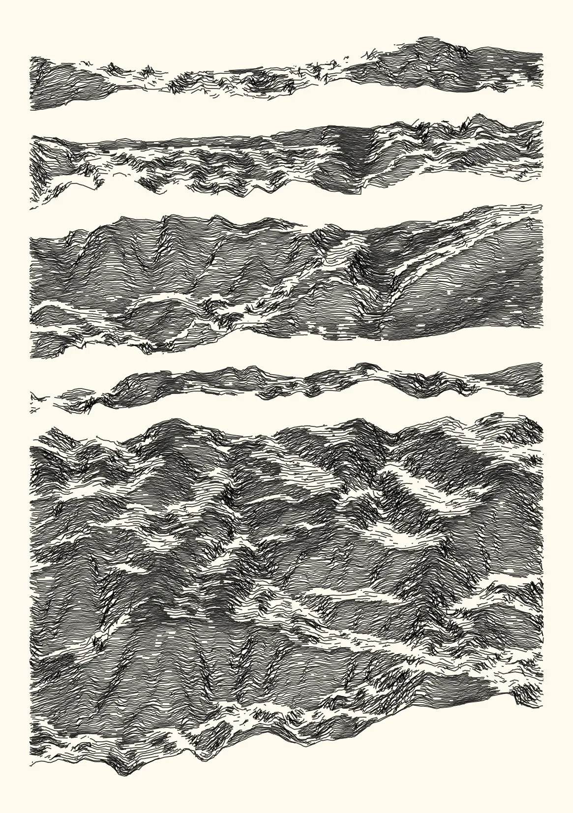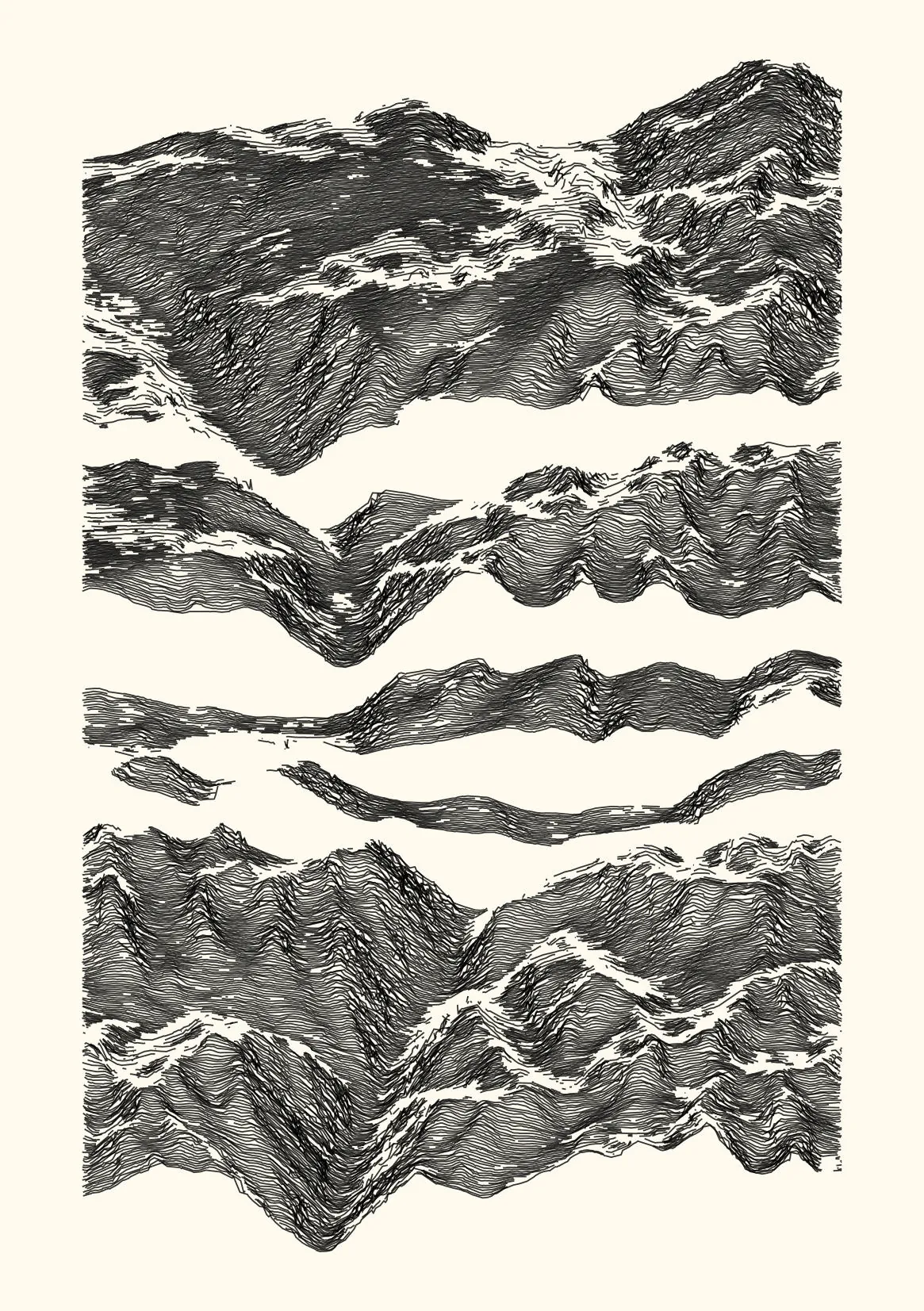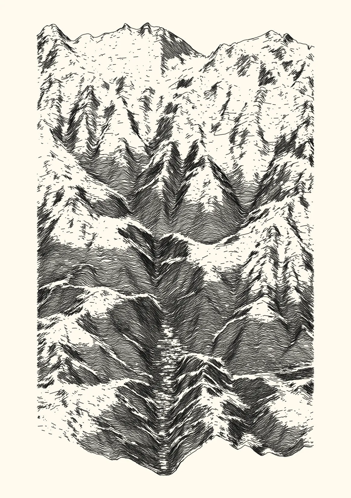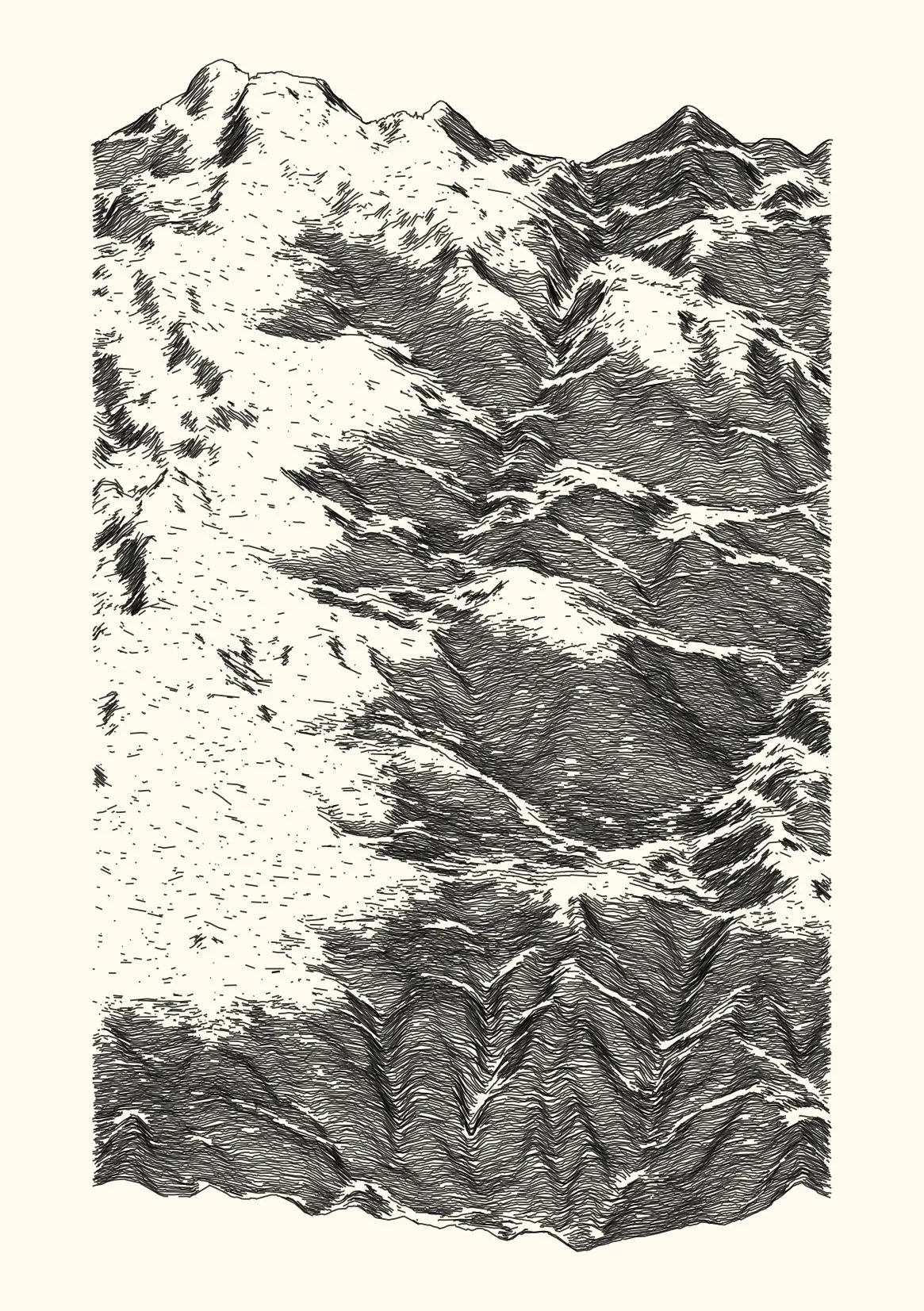 get_features_ridge(seed = 15) |> gen_dispyr(n_ridges = 800) |> plot_ridge()Process topographical data into monochromatic ink sketches.