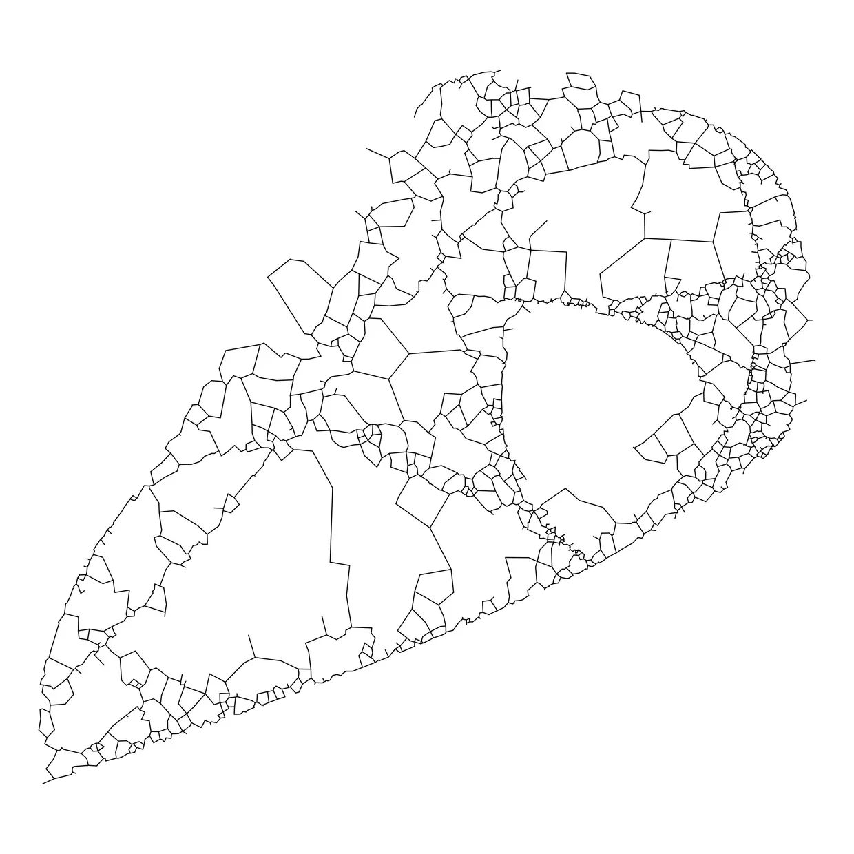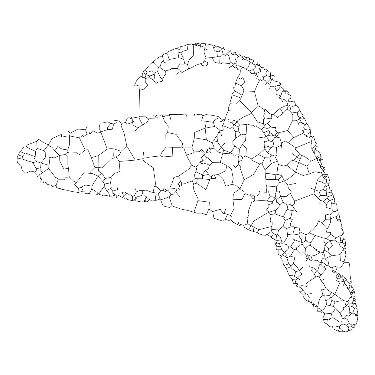 While this method is a very good generator for diverse 2D shapes, it is not compatible with pen-plotting because of the difficulty to create paths from those point sets - the points are not ordered by the iterations of the difference equation, and jumps from one position to another. One solution is to define the relative neighbourhood graph on a subsample of the simulated set of points.