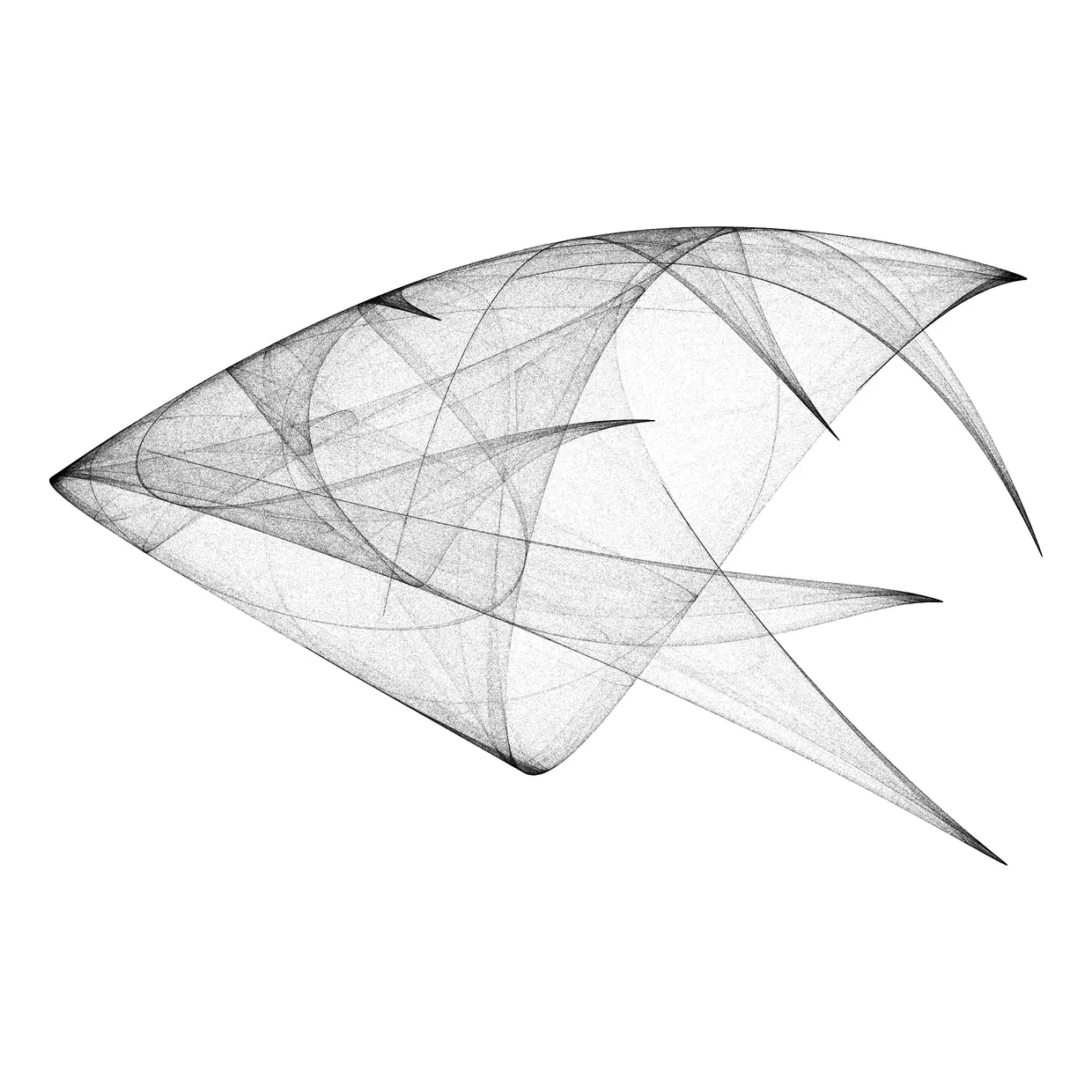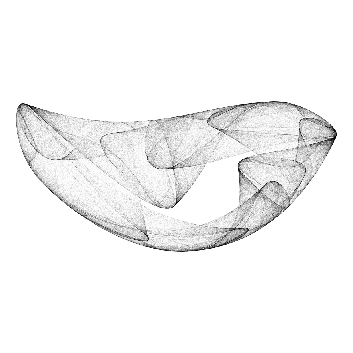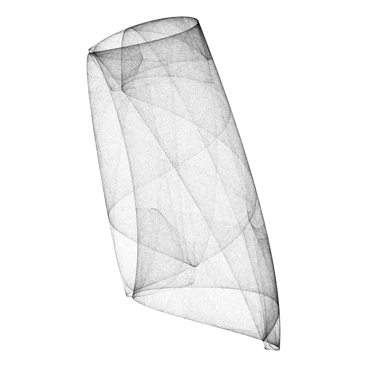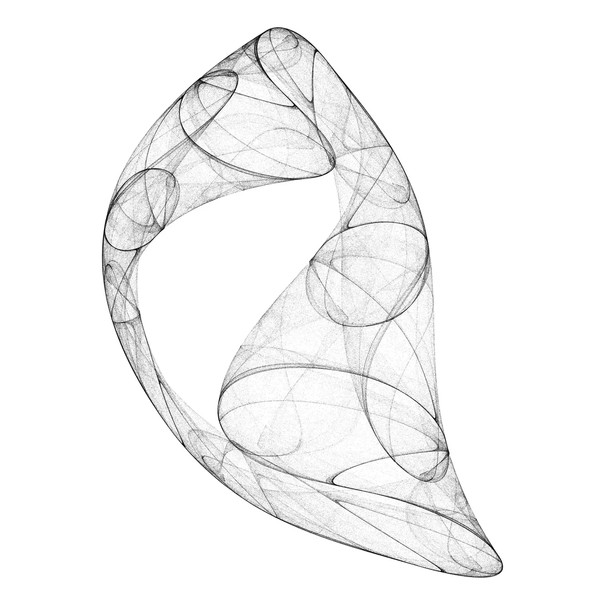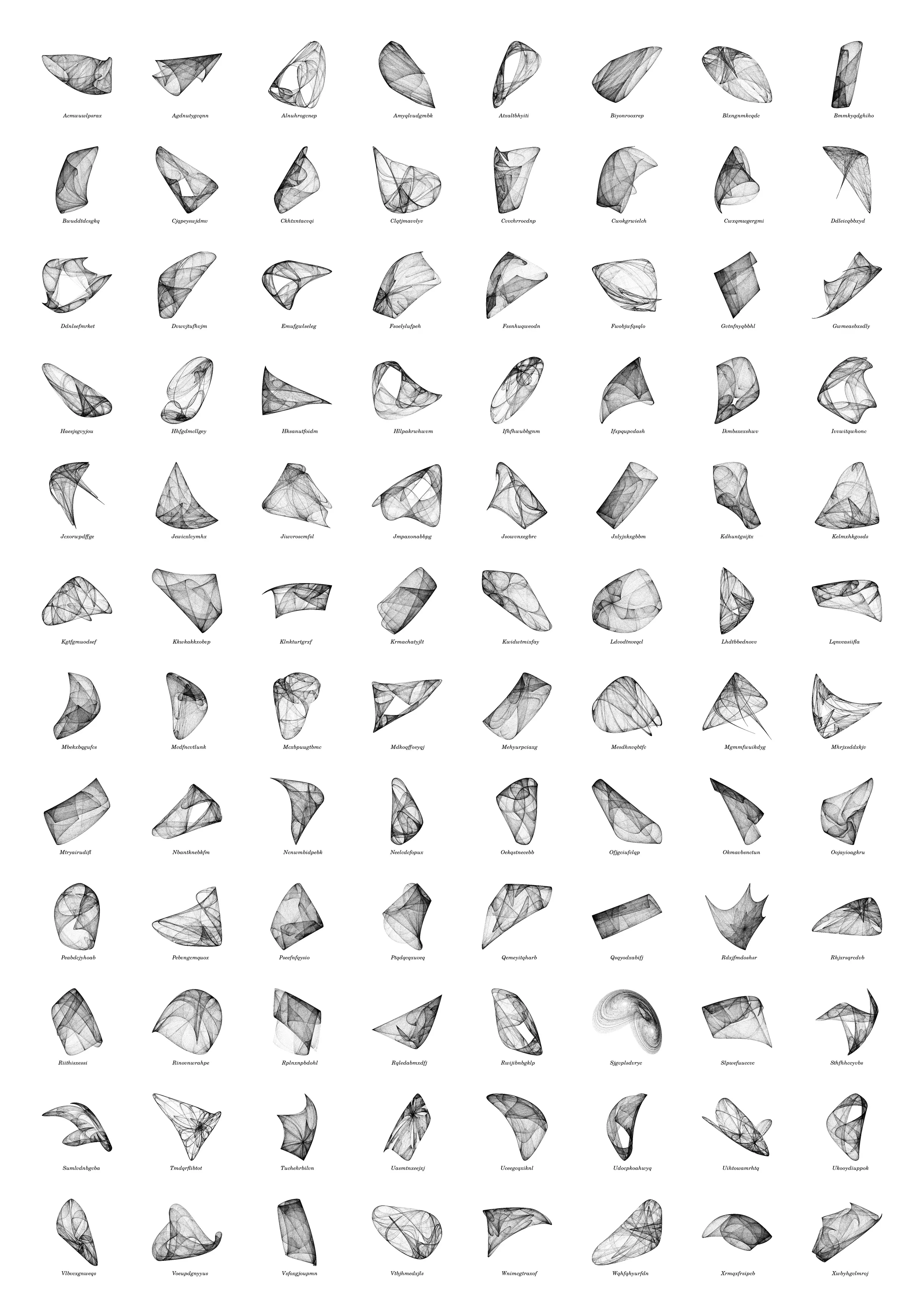 The algorithm is based on a system of difference equations, with 12 parameters. The first step is to sample the parameter space by using a discrete scale of 26 values for each parameter so that each sample can be assigned a “name” with 12 letters. A second step discards failed solutions (convergence to a point, divergence) and filters the aesthetic ones, based on a set of criteria (Lyapunov exponent, summary of point density distribution, correlation). Overall, very few solutions are selected (~ 0.1 %).